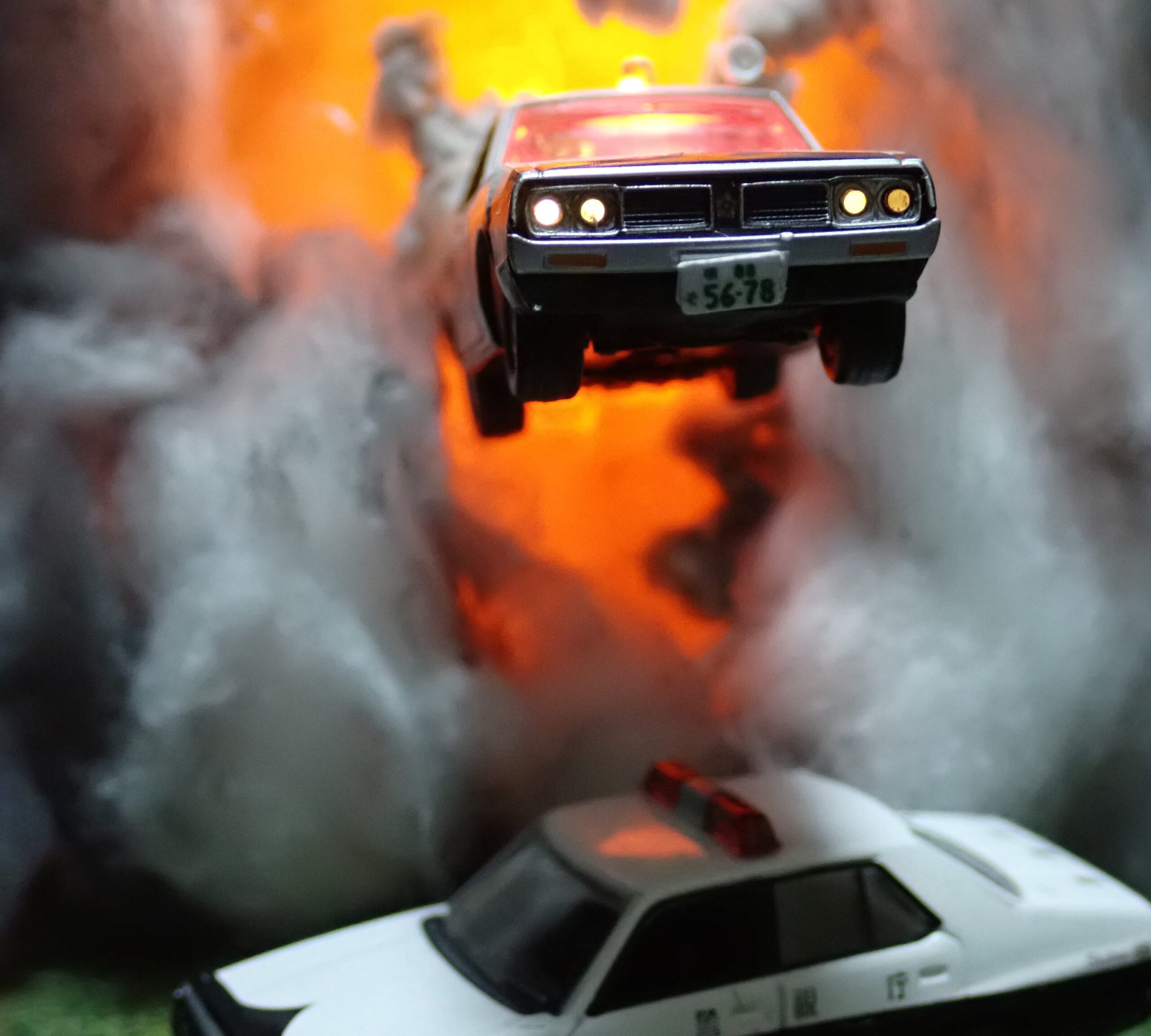 工作用紙もプラ板も、3Dプリンターもいらない。パトカーなんか手持ちの既製品があるし、ちょっと加工して。ダイソーで小さなディスプレイケース買ってくれば、爆誕ですよ。