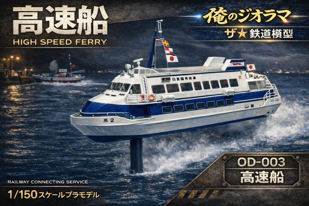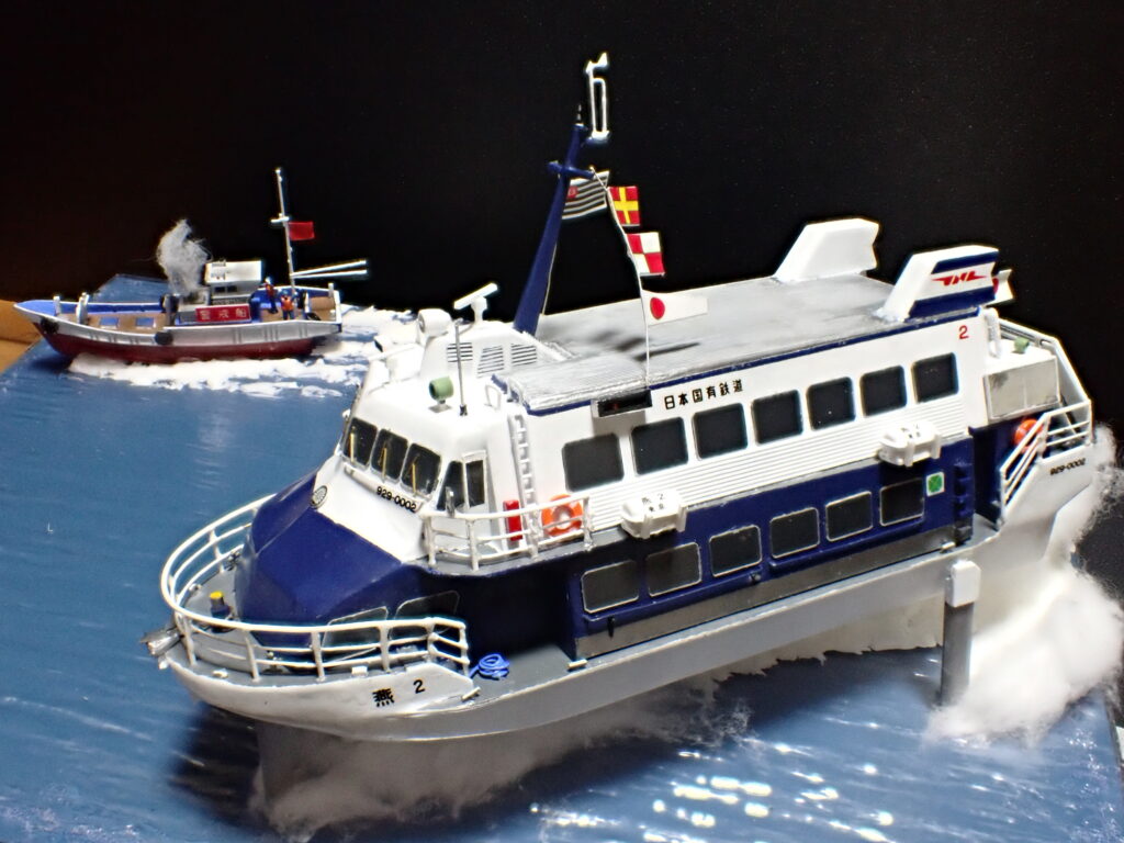 連絡船物を作りたいと考えましたが、先達が制作して発表しているNゲージスケールの模型でも結構でかいし、着手したら長丁場確定で、その間、他の物が作れなくなるのはシンドイと思いまして。宇高連絡船のホバークラフトはベタな感じがして、どうしたものかと悩んだところ、変態的な発想で自分をごまかすことにしました。国鉄所有の水中翼船型の高速船をでっちあげました。